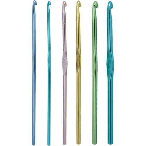 Boye aluminum crochet hooks feature a rounded head and tapered throat. These hooks are lightweight, inexpensive, and great for both beginners and experienced crocheters.