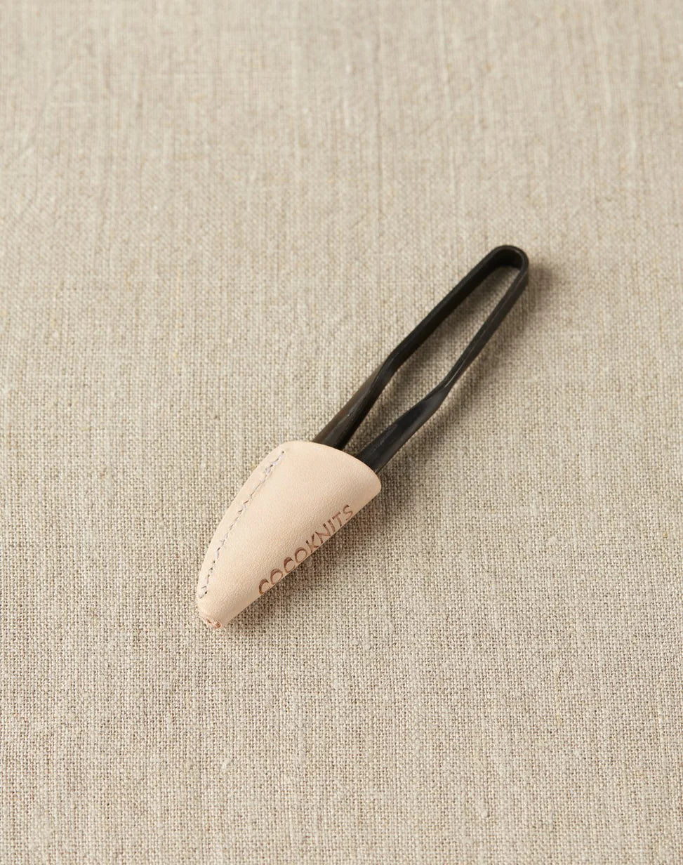 Forged iron snips are an ancient concept – you may have seen larger ones once used for sheep shearing. Ours are the same concept, but much smaller. So many snips have razor-sharp blades with plastic handles, a no-go for me. Ours are rustically forged from one piece of steel so they will never break. They are slim, don’t require you to unfold or get your fingers through openings, and are approved for TSA travel through security (a blade less than 3" long). Streamlined and good for only one thing – snipping yarn. Each snip/scissor comes with a natural vegetable-tanned leather protective cover.