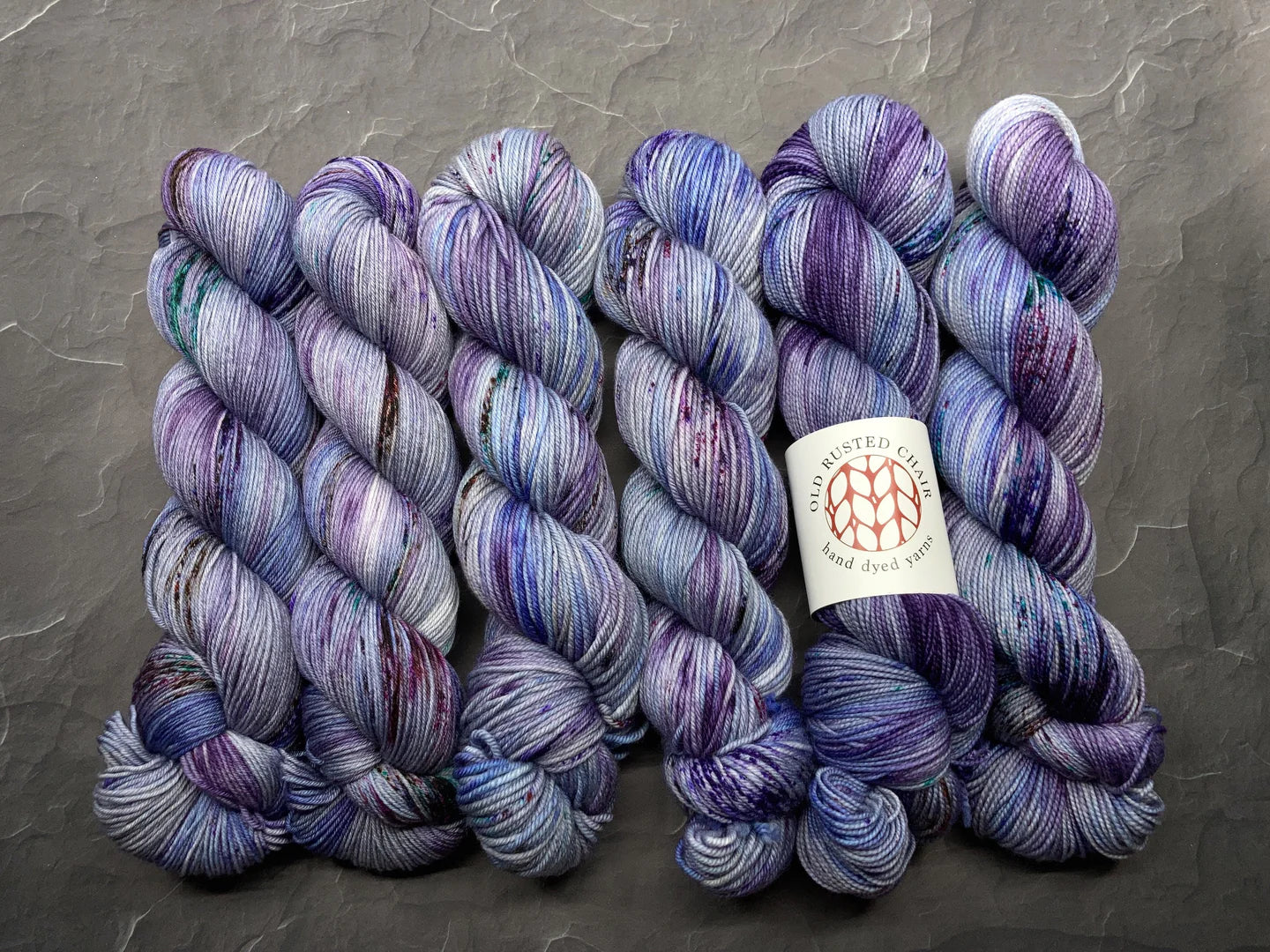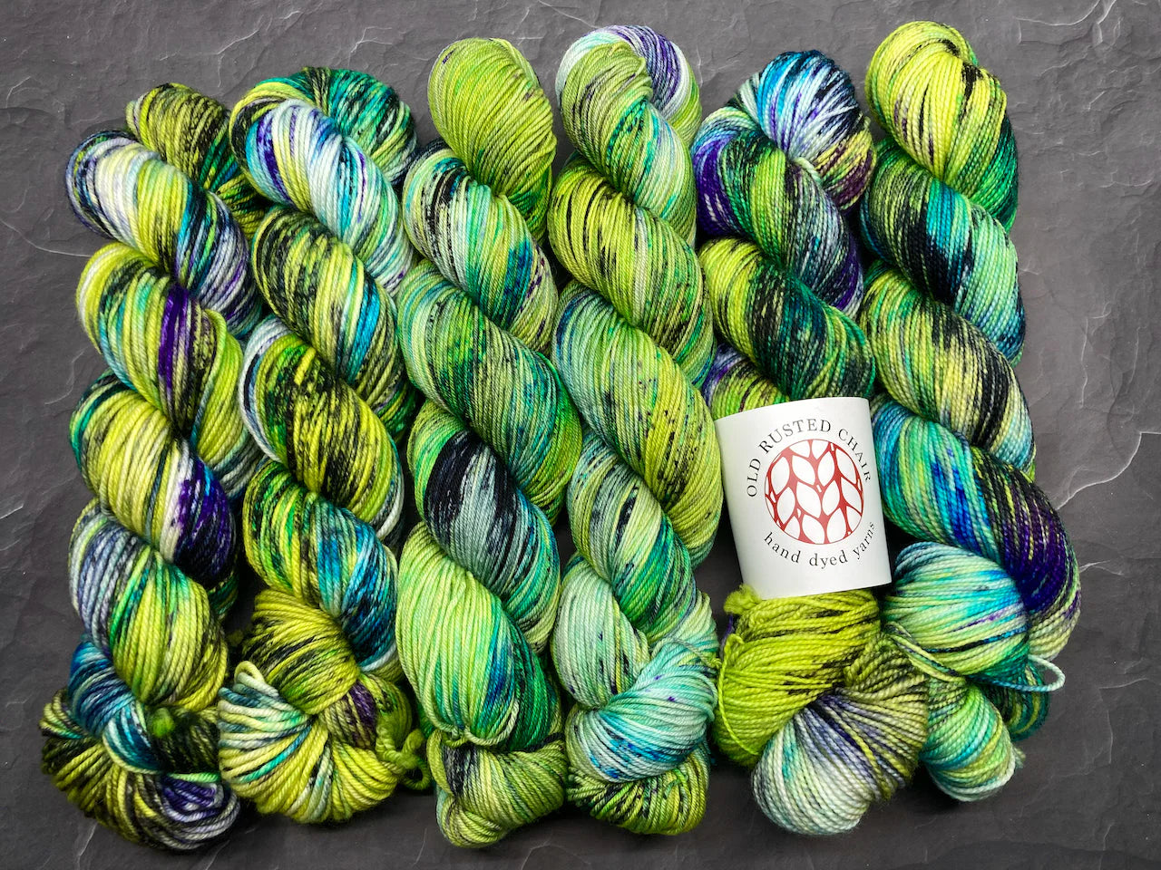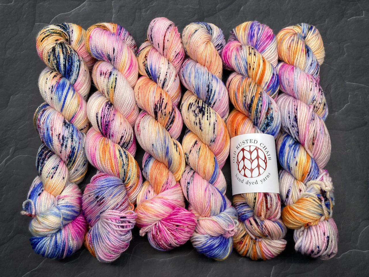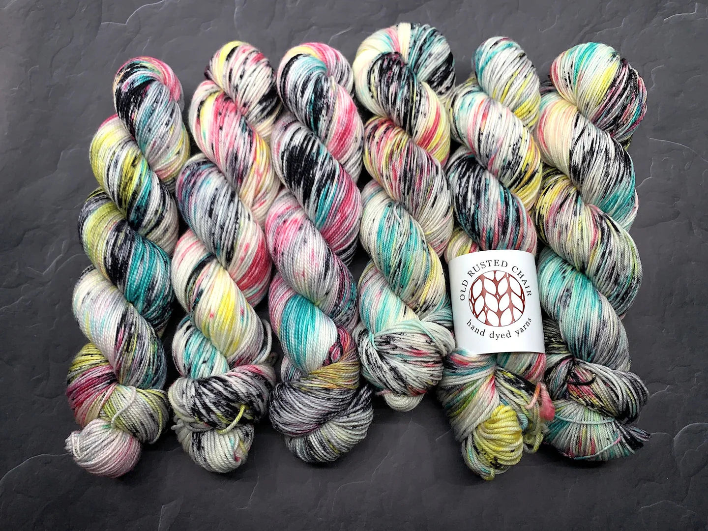 Old Rusted Chair Sock is hand-dyed by Lou, in her home studio in Tennessee. These vibrant and fun colors are great for everything from socks, hats, and mitts, to sweaters and shawls.