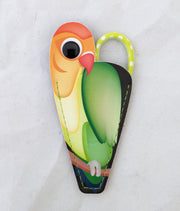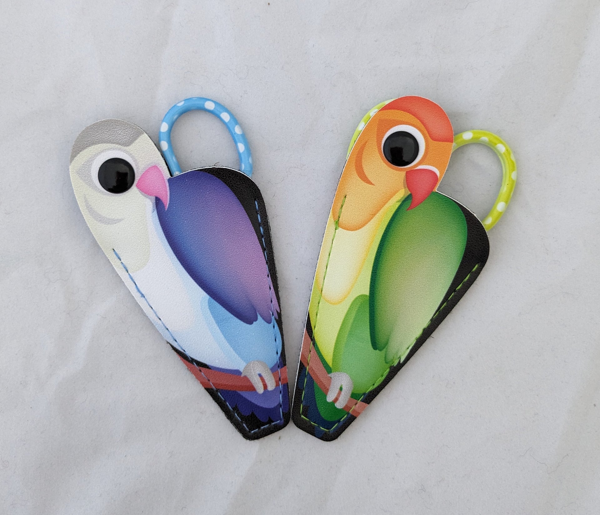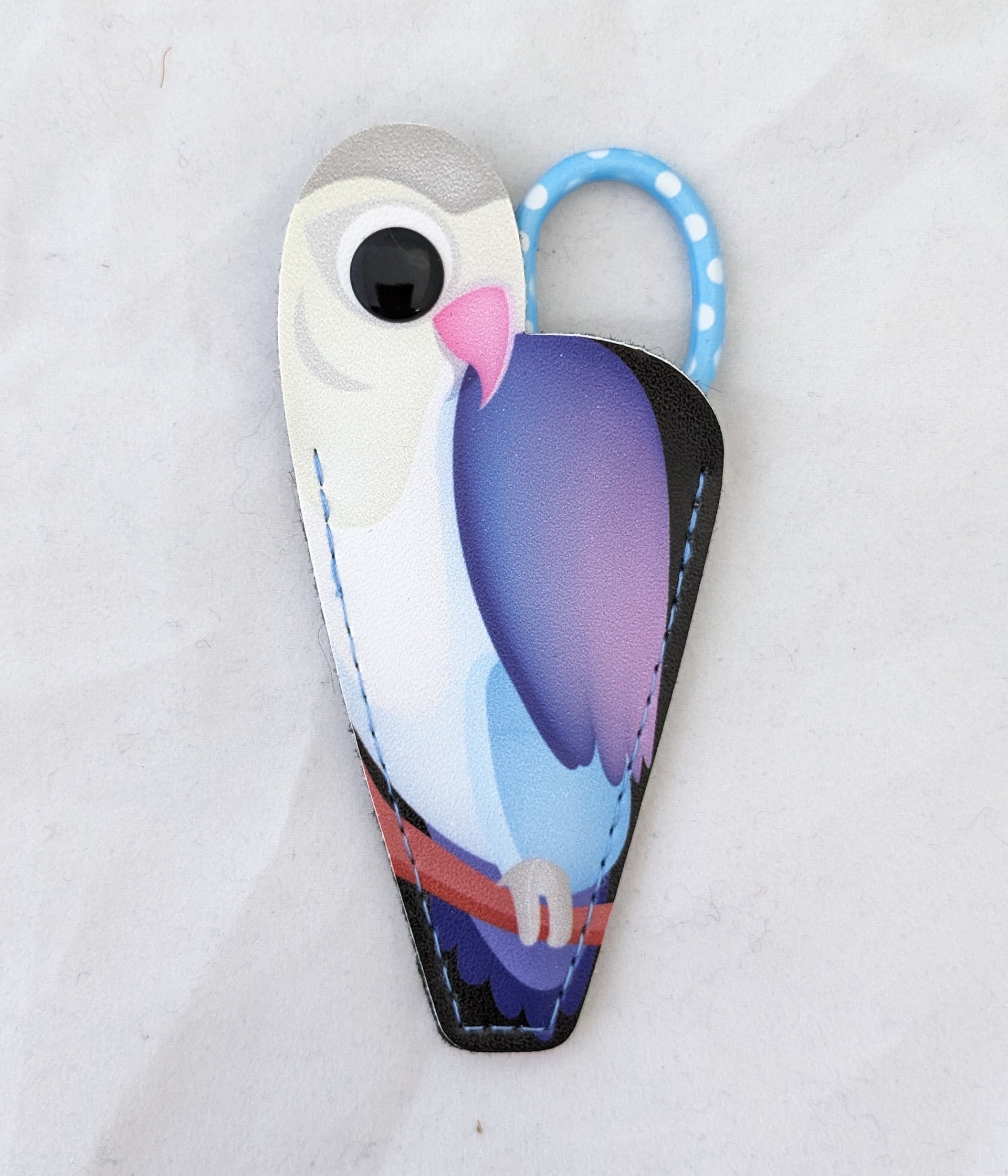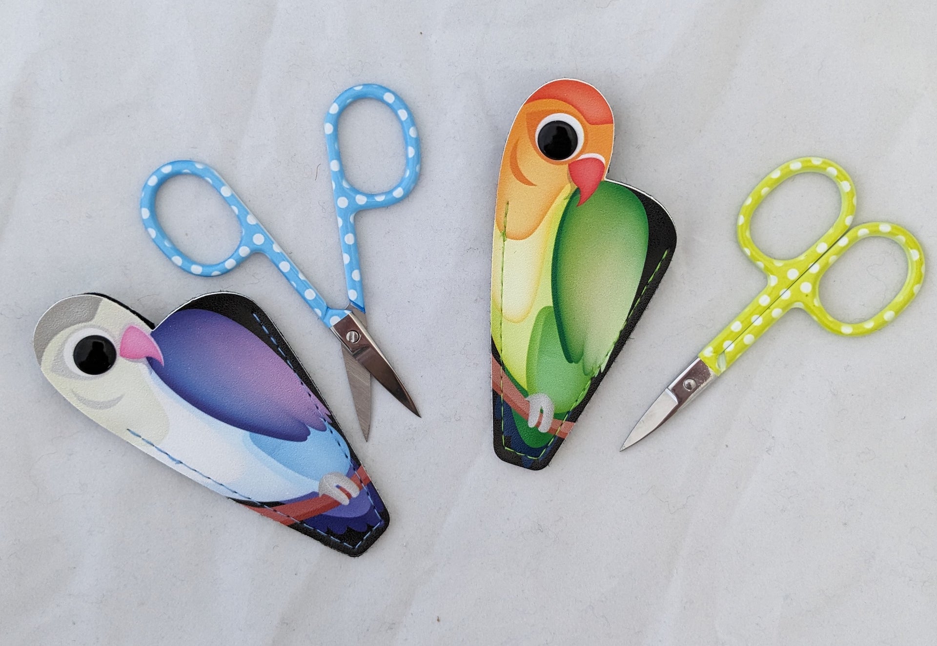 Polka dot handle embroidery scissors that tuck into an adorable parrot sheath.