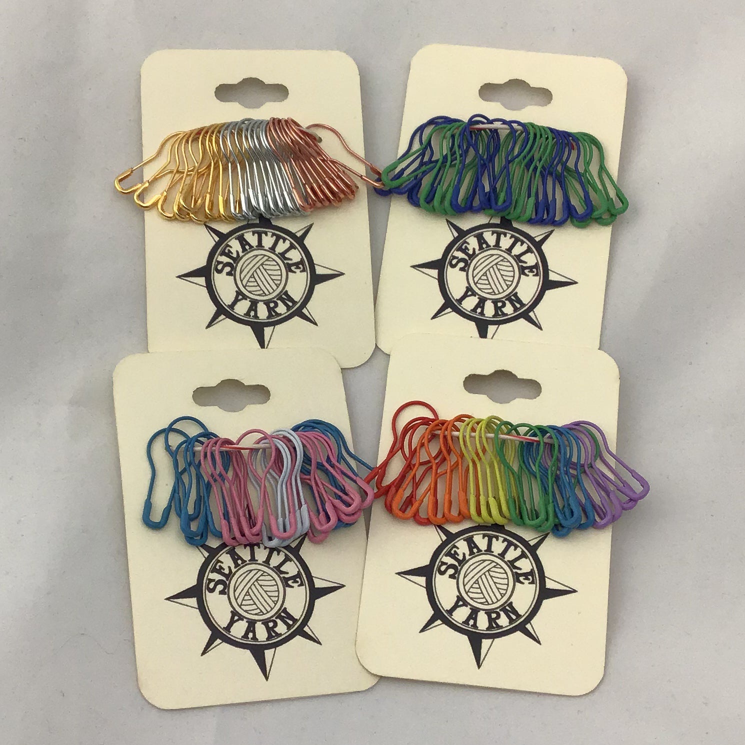 Set of 24 locking stitch markers. Assorted colors - colors not guaranteed, but feel free to tell us a preference or strong dislike and we can try to accommodate!