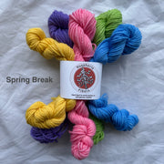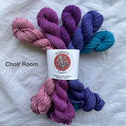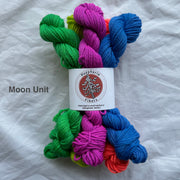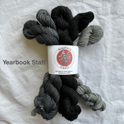These 5-skein sets are using Student Council DK from Huephoria Fibers, a sturdy merino/nylon blend that is perfect for all kinds of projects, from garments to accessories.