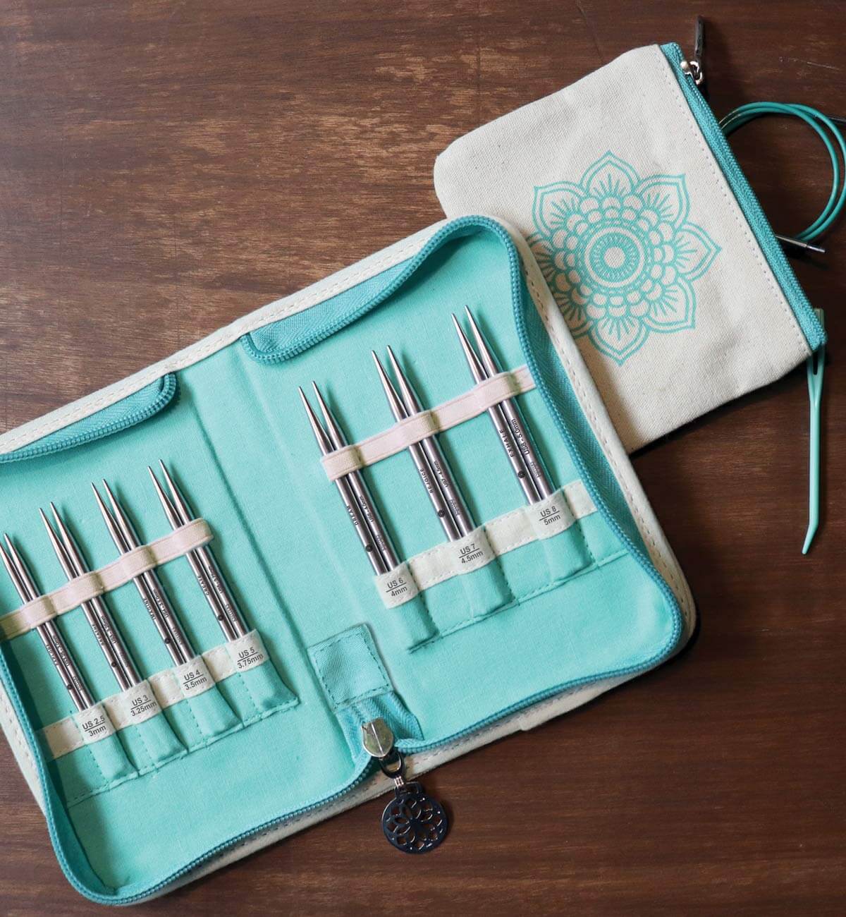 Mindful Collection Interchangeable sets by Knitter's Pride. These collections of stainless steel lace interchangeable needles, cords, and accessories will be a joy for any knitter to have! Sets come packaged beautifully in a fabric case with floral motif, and zippered accessory pouch.