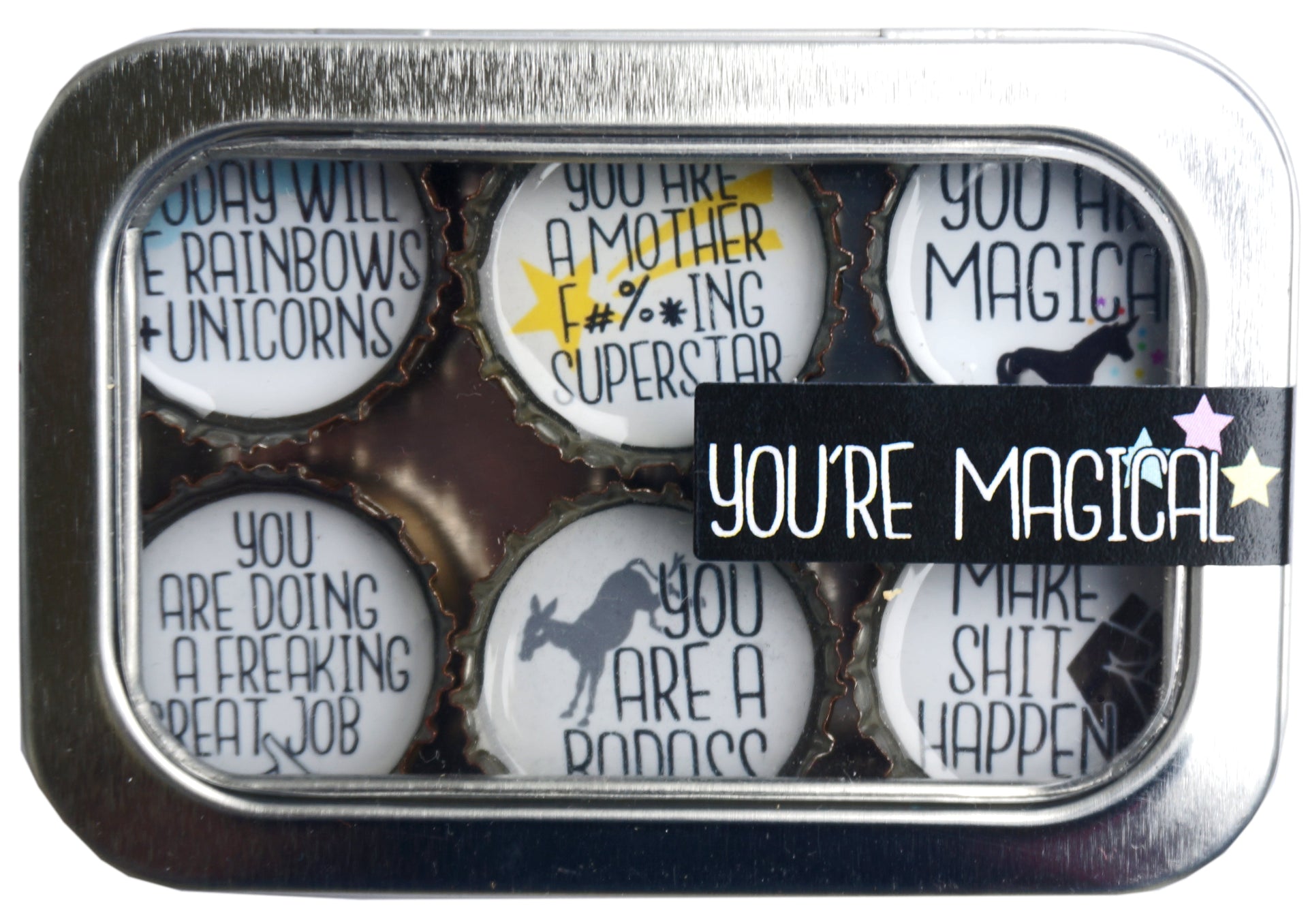 These super cute six-pack bottle cap magnet sets are made from recycled products, eco-friendly, and handmade locally.