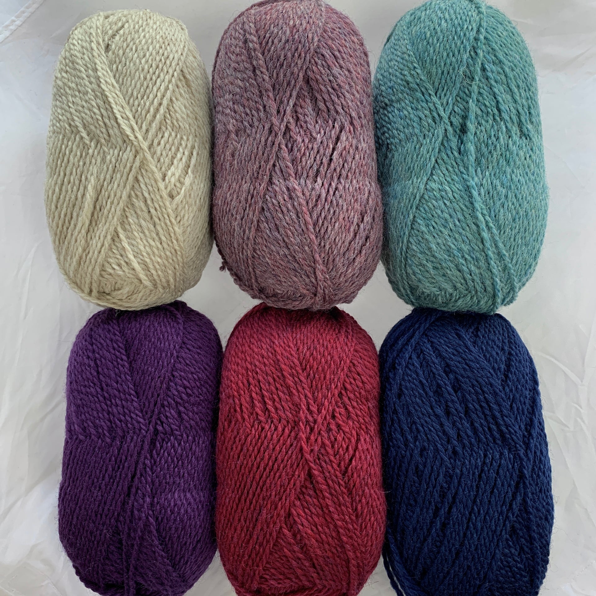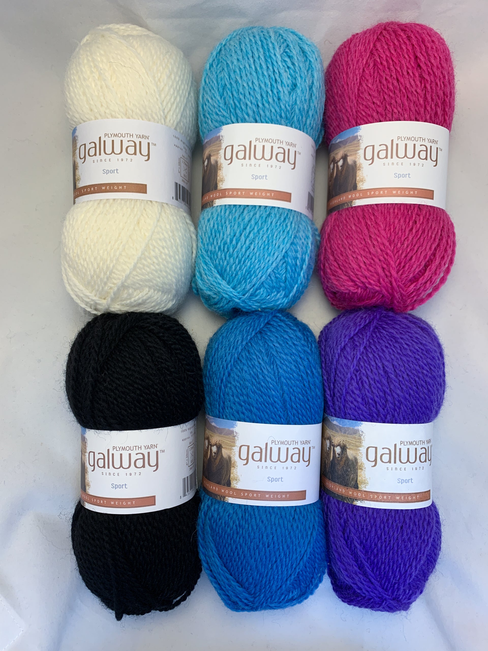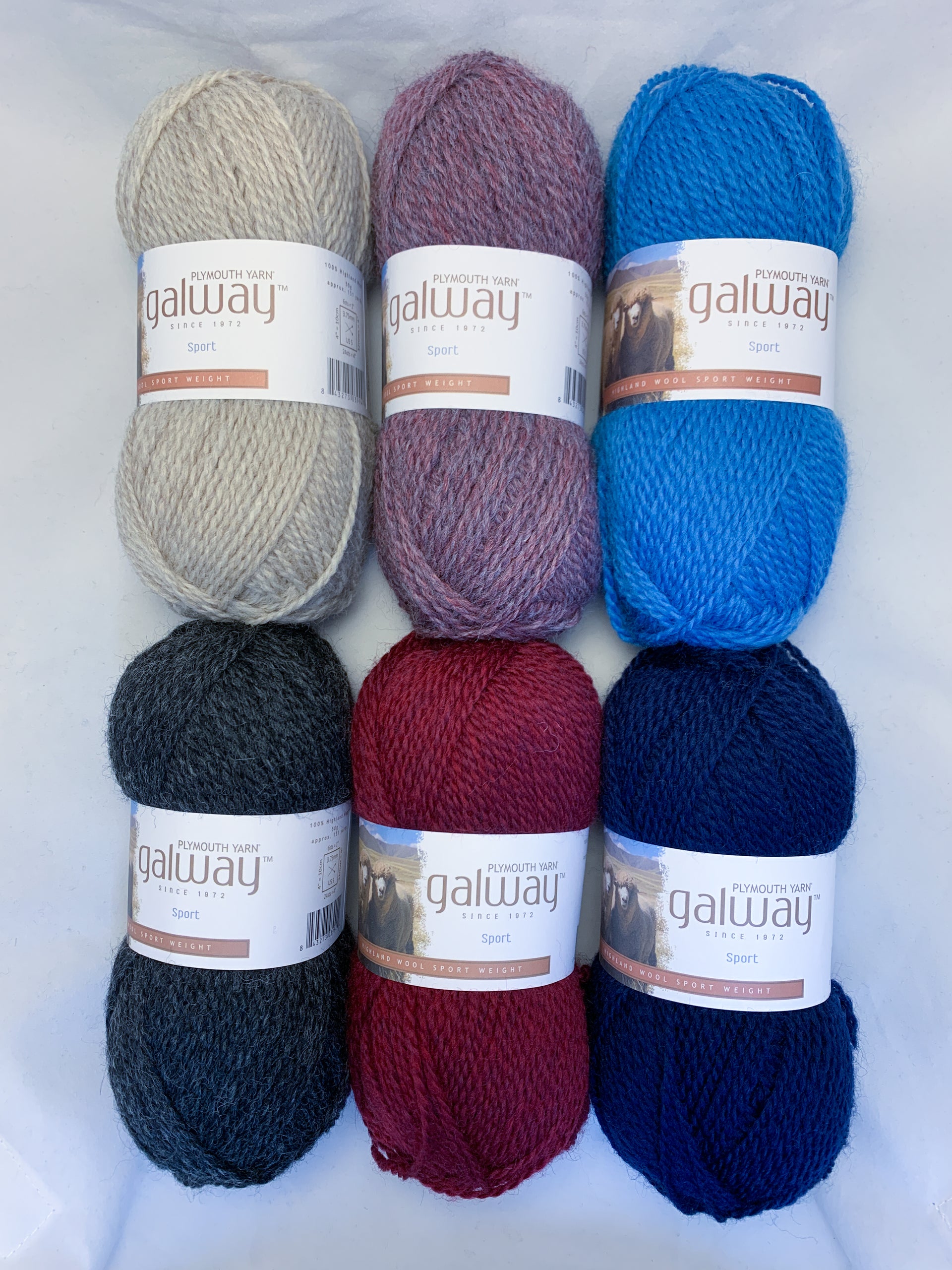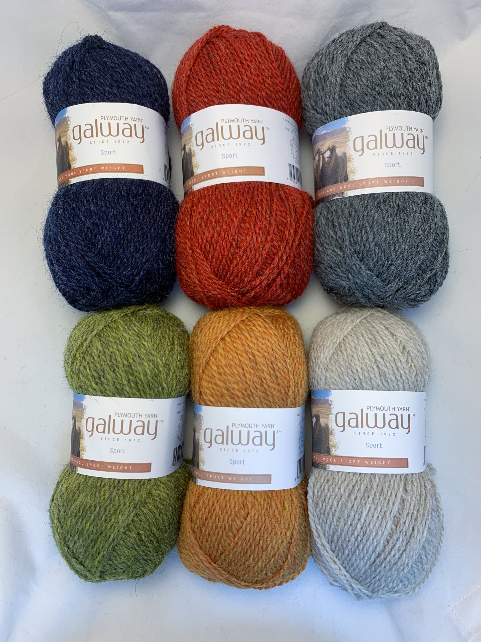 These kits include 6 colors (50g balls) of Galway Sport, enough to knit the Accidental Island pattern. Pattern sold separately.
