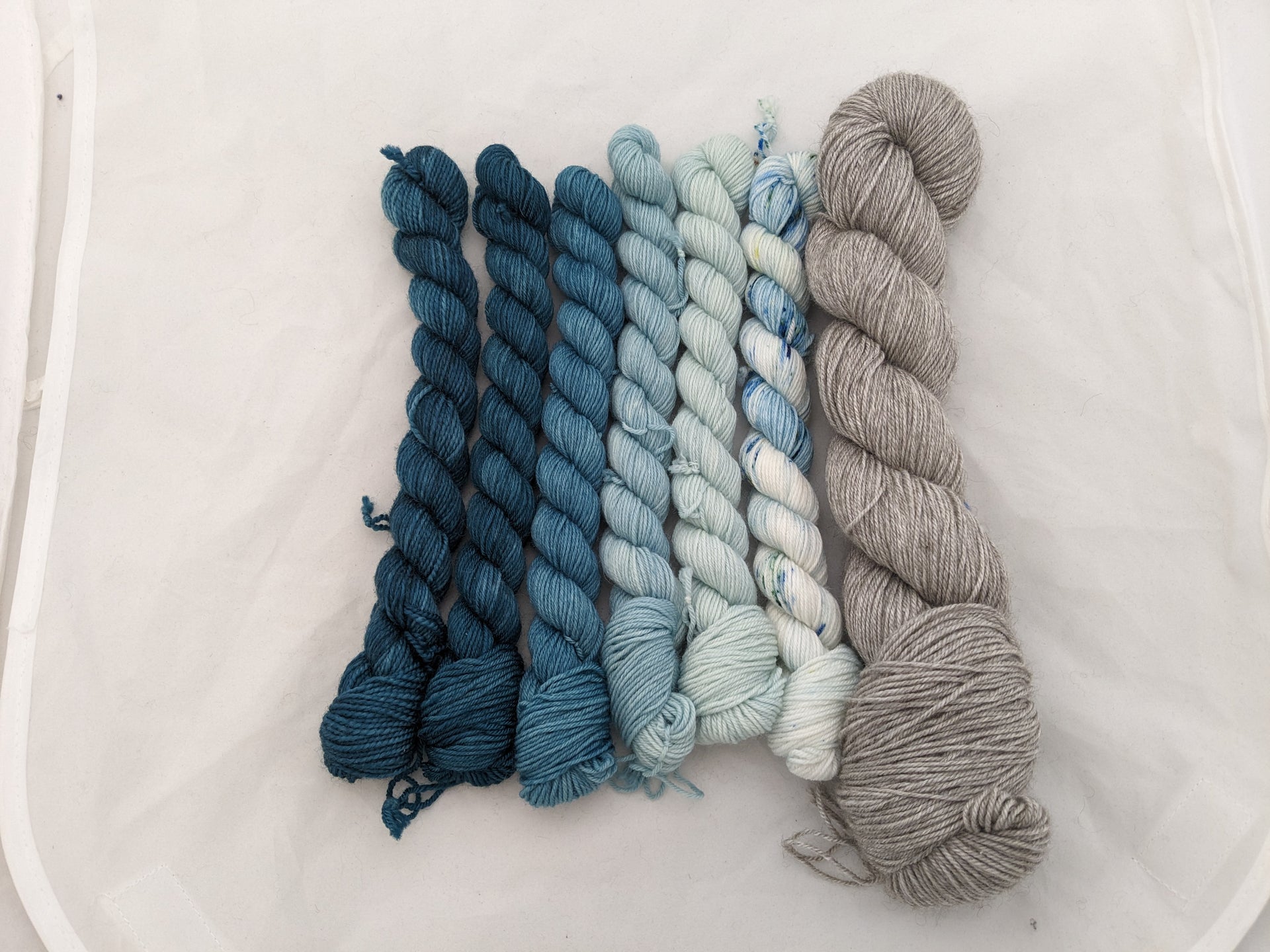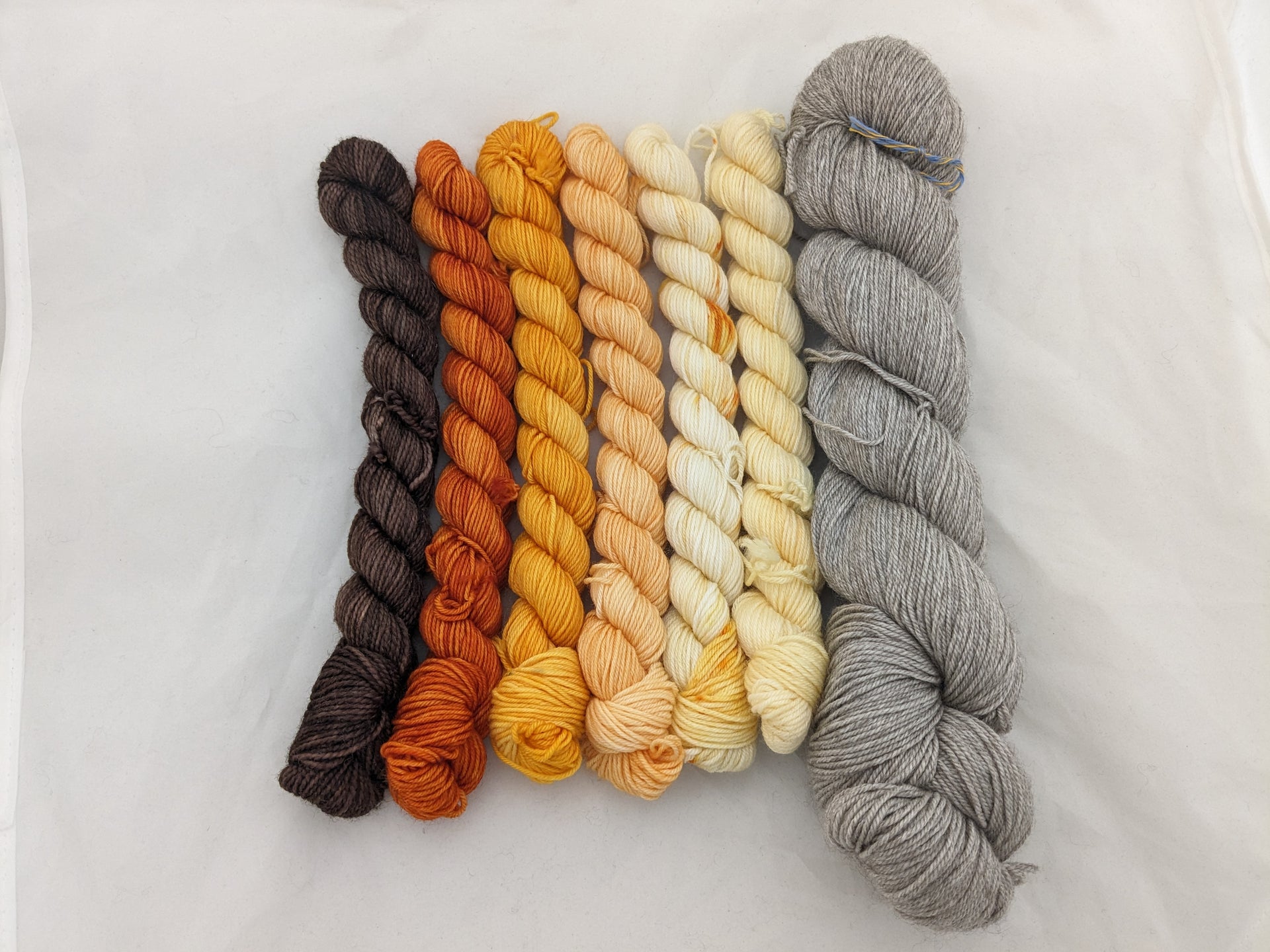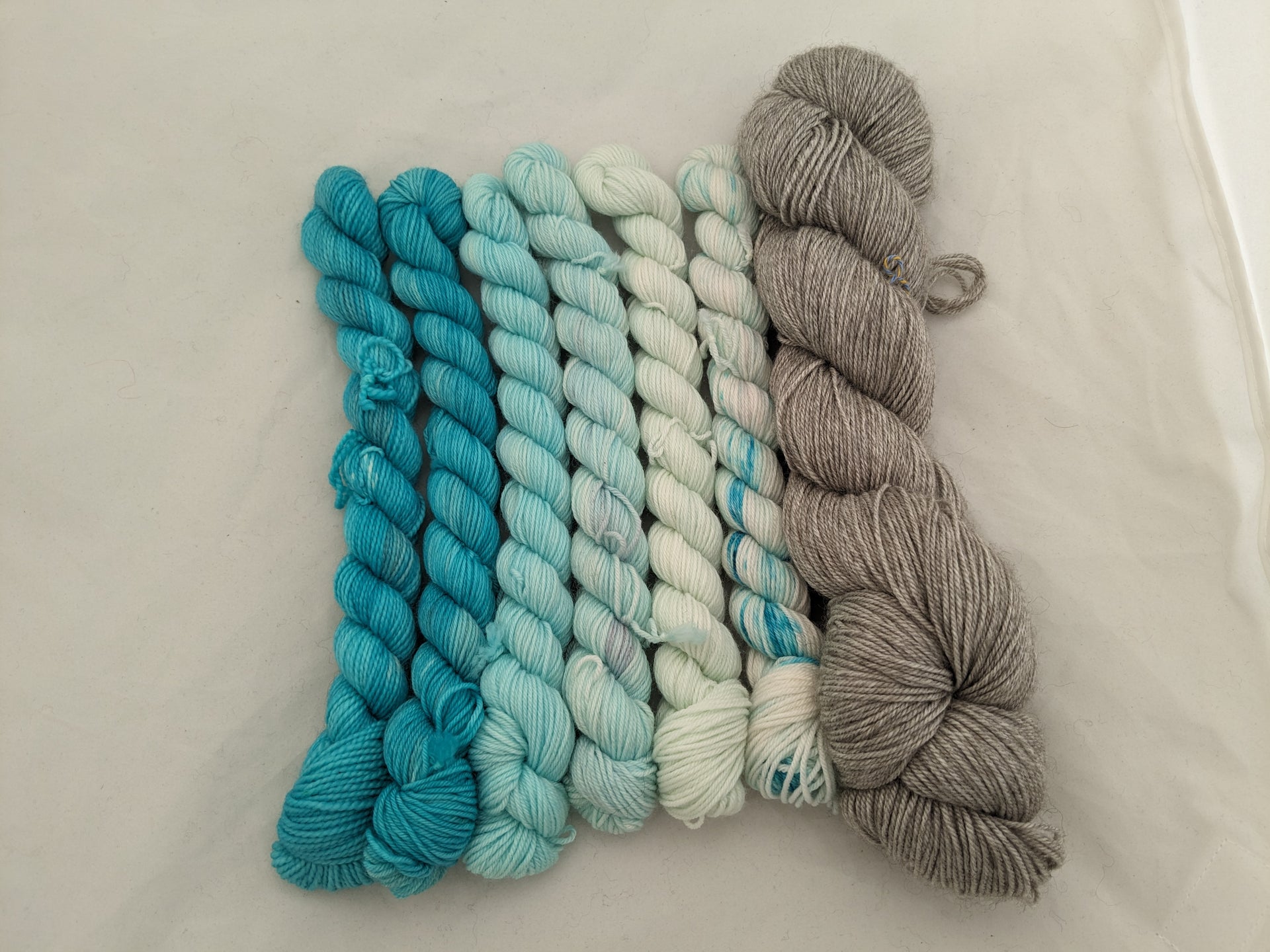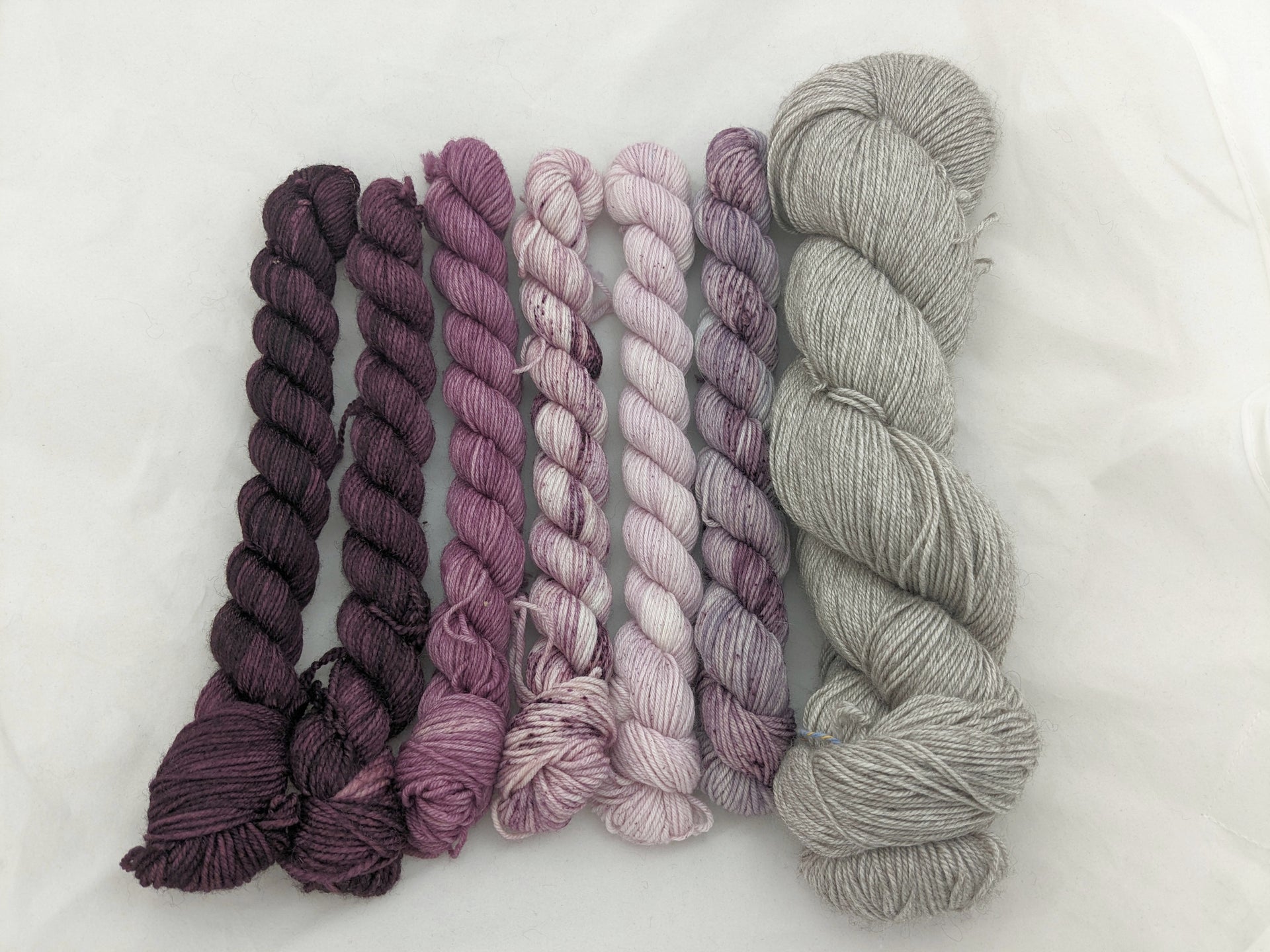 - The gradients begin with a speckled white with 4 more skeins growing gradually darker each containing 92 yards of 75% superwash Merino, 25% nylon